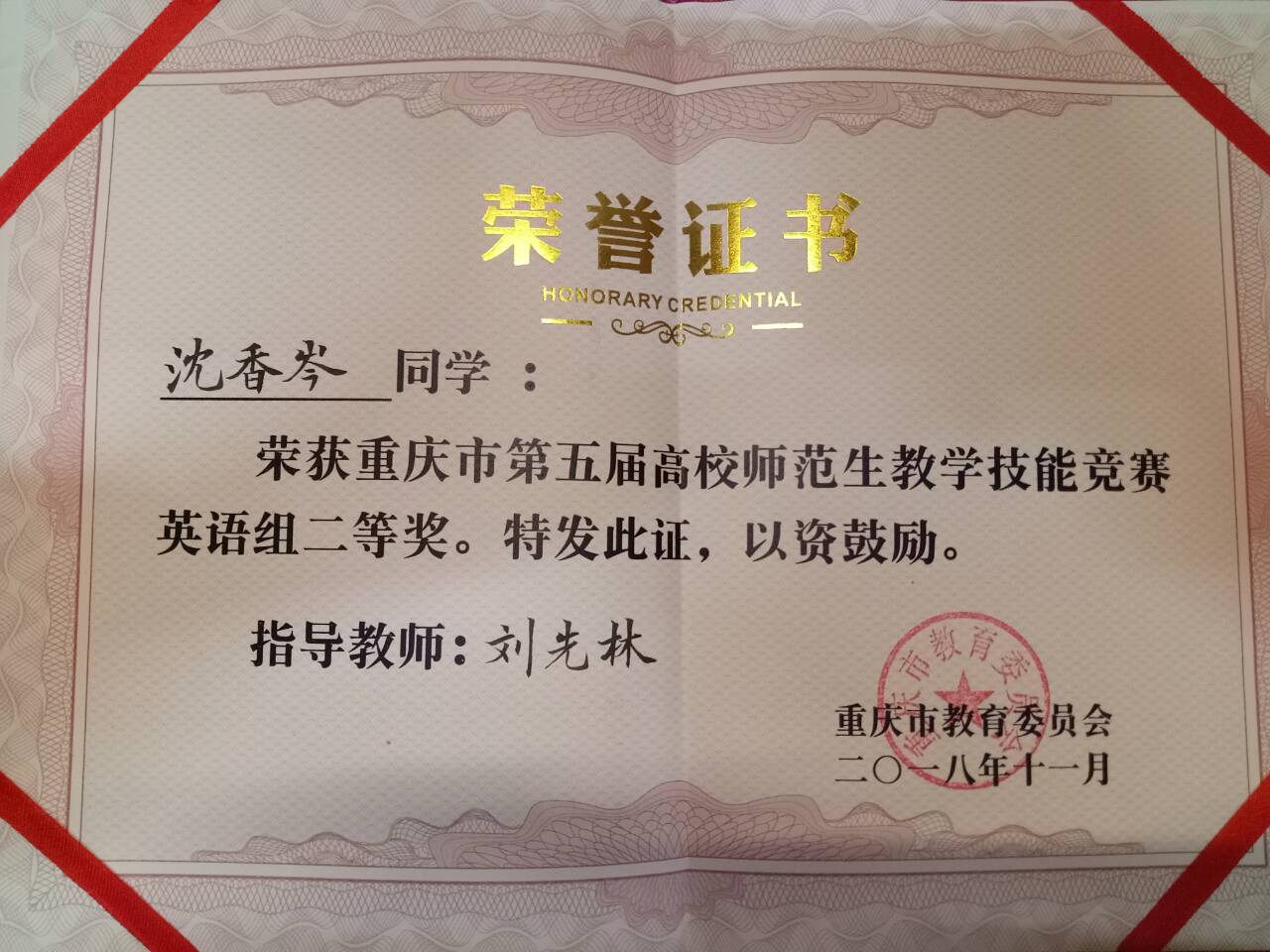 经过激烈的角逐,沈香岑同学荣获重庆市第五届高校师范生教学技能竞赛英语组二等奖。据悉,这是我校参赛选手在本次比赛中荣获的最高奖项。