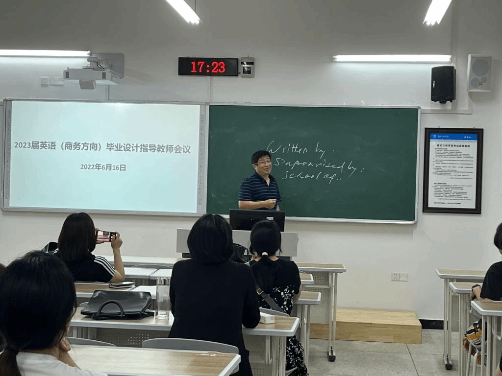 会上,乔春华副教授首先梳理了2022届毕业设计检查工作中发现的问题,做了详细解读,对2023届学生的毕业设计指导工作提出了具体的要求,强调规范毕业设计工作流程和细节。接着,王晓蕾老师结合自己的指导实践,以情景模拟选题为例,从选题、脚本撰写、报告撰写及视频录制等方面分享了如何全面有效地指导并考察学生的商务理论和实践能力,全体教师对此展开了热烈的讨论。最后,学院党总支书记甘长银书记强调毕业设计工作是本科教学工作中的重要环节,全体教师应认真落实毕业设计工作,既要严格要求学生,同时也要有人文关怀。此次会议为即将启动的2023届学生的毕业设计工作做好了铺垫。