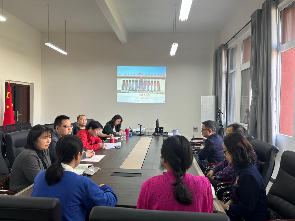 唐淑华副院长就学校党的二十大精神理论阐释工作座谈会相关情况及相关领导的重要讲话精神等做了传达,强调成果导向、有组织的科研。与会同志进行了积极的交流,学院党总支书记提出了理论阐释工作的要求,组好团队、选好方向、深入开展此项工作。