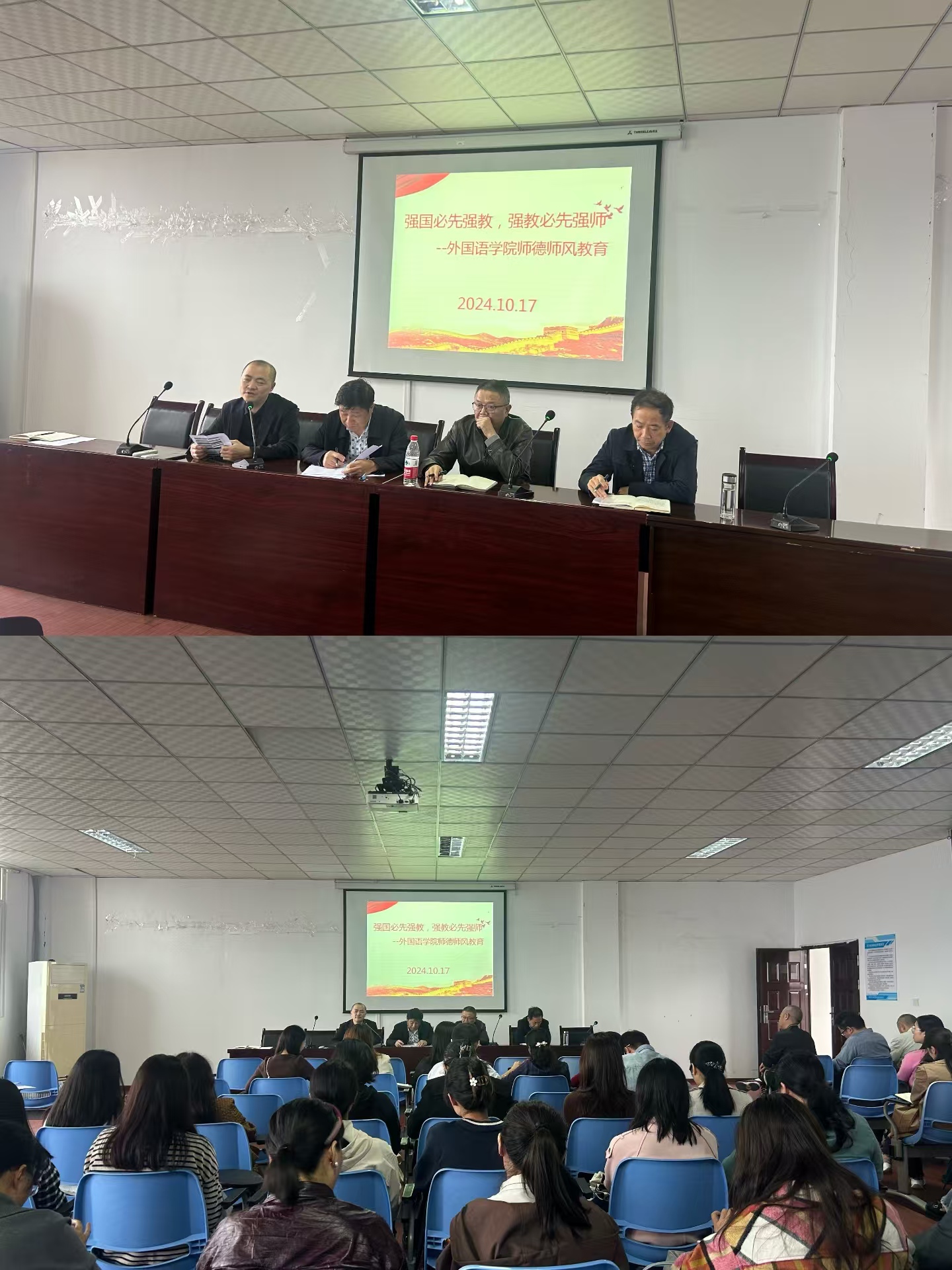 为了学习贯彻习近平总书记在全国教育大会上的重要讲话精神,我院于2024年10月17日下午,在明辨楼1-604教室召开师德师风教育会议,会议由学院党总支书记甘长银主持。