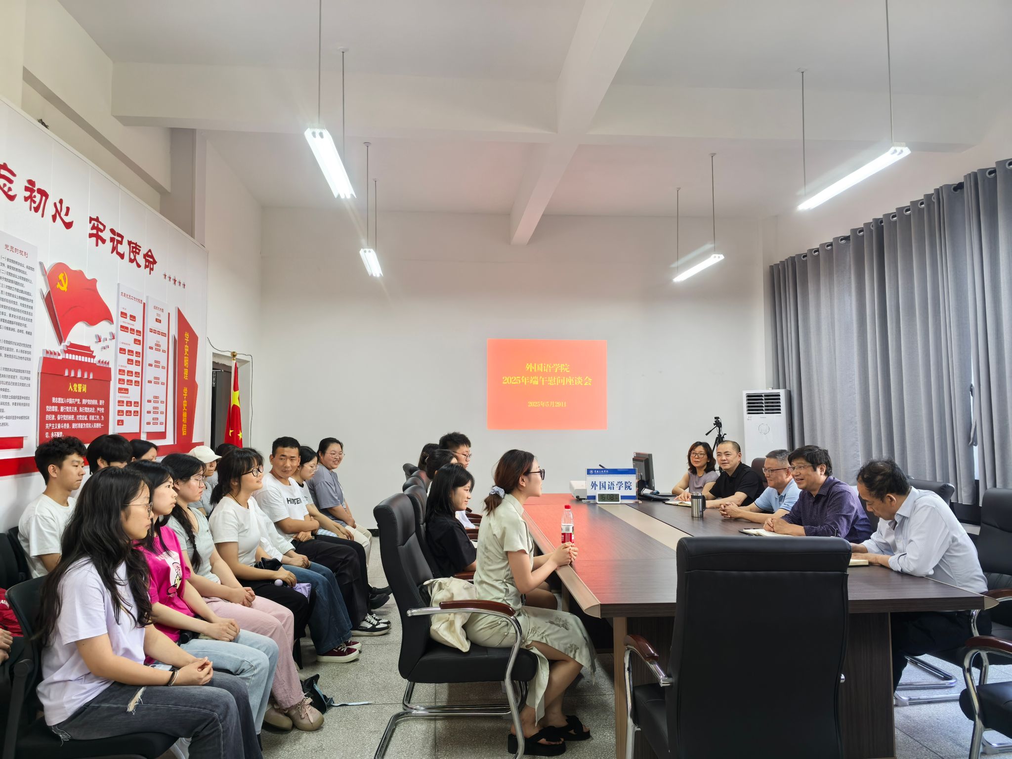 为弘扬中华民族优秀传统文化,进一步强化人文关怀,5月29日下午,学院在博学楼3-315会议室召开了2025年端午慰问座谈会。学院党政领导、学工办主任、全体辅导员及慰问学生代表共计40余人参加座谈。