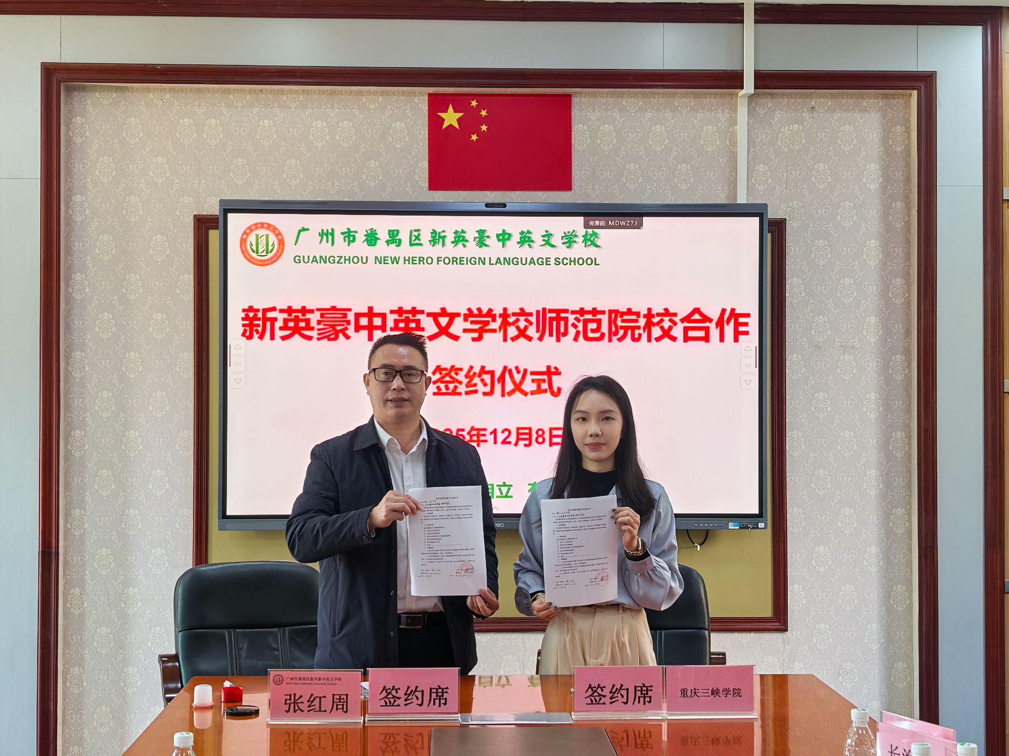 次日,张雪、陈可昕先后走访广州市番禺区新英豪中英文学校、东江外语实验学校,开展实地座谈。双方围绕人才培养、实习实践、师资需求等展开讨论,并就共建实习基地、定向培养等内容达成共识,最终签署合作意向书,奠定长期合作基础。