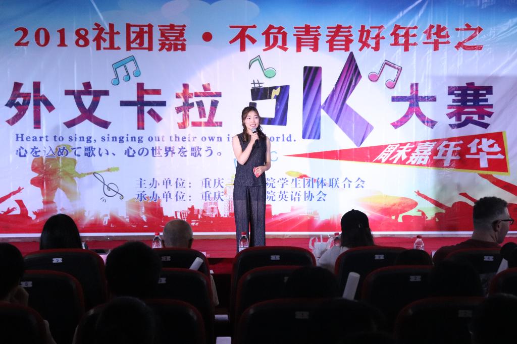 6月10日19:30,我校社团嘉﹒不负青春好年华周末社团沙龙外文卡拉OK大赛决赛在2教104顺利闭幕。必赢242网址英语系王浩、汪伟玲老师,英文外教Tara、Gregory、日语外教伊九美峰雄担任此次比赛评委。本次活动由我校英语协会承办。