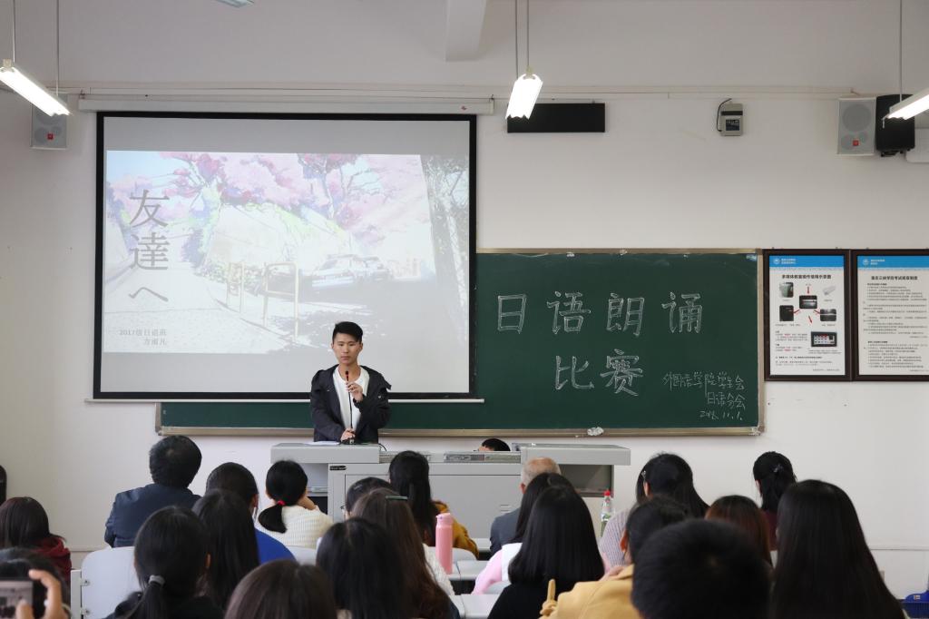 比赛分为专业组和非专业组,选手依次上台用日语进行朗读,并由评委进行打分。专业组陈春莉同学朗诵了亲情故事《爸爸的十宝菜》,非专业组的邱栗滟讲了《白雪姬》的童话故事。选手们用诵读的方式歌颂友谊、有回忆童年、缅怀过去、憧憬未来。经过激烈的角逐,余志伟获得大三专业组第一名的好成绩,陈春莉获得大二专业组第一,非专业组的第一则被大三的邱栗滟收入囊中。