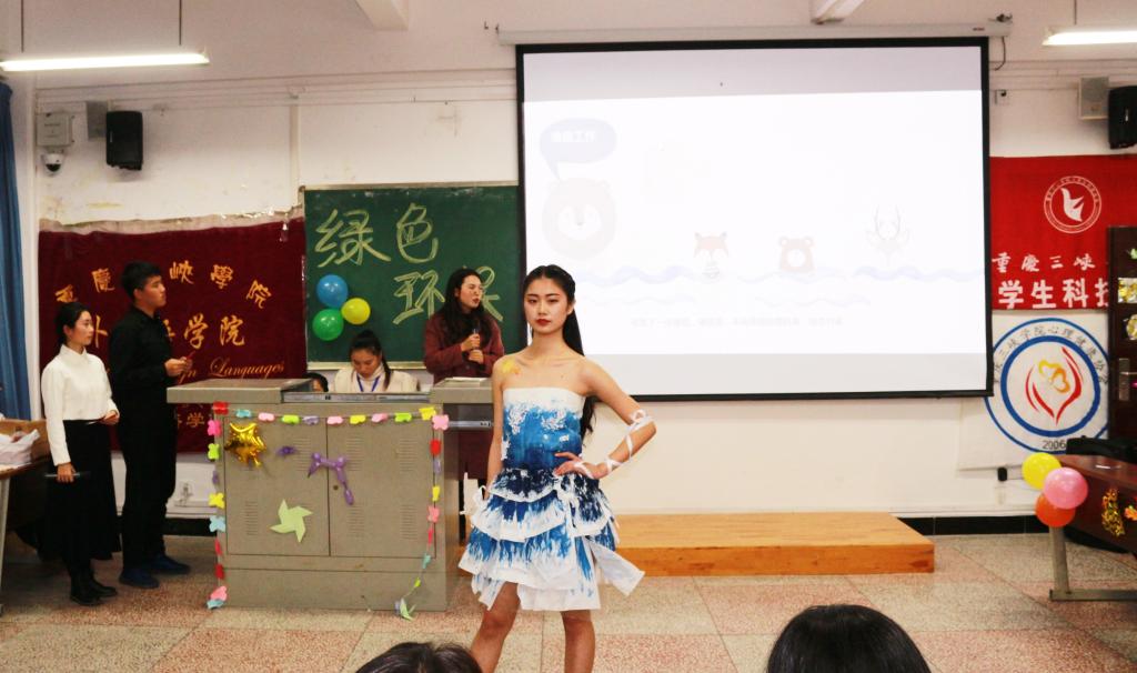为大力弘扬环保精神,深入贯彻环保理念,培养青年环保意识,必赢242网址学生会心理健康协会、科技协会于11月30日19:00在明辨楼1栋501顺利举行了以“绿色满校园,环保留心间”为主题的环保时装秀比赛。