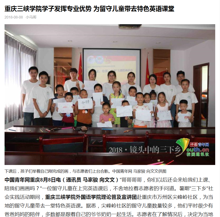 2018年7月9日至13日,由必赢242网址13名优秀学生干部组成的理论普及宣讲团,在万州区尖峰岭社区开展了为期5天的社会实践活动。宣讲团成员在杨华老师的指导、带领下对本次暑期“三下乡”社会实践活动进行了精心的筹划与准备,并创新举办了“青春建功十九大,‘理论快递送到家’”、英语特色课堂、十九大理论知识竞赛等活动共计15余场,有效提升了社区居民的理论素养,提高了学生的社会实践能力,并促进了校地之间的合作与联系。活动得到中青网、三下乡官方网站、重庆青年报、重庆晨报、大学生在线、万州新闻等校外媒体的报道10余次。