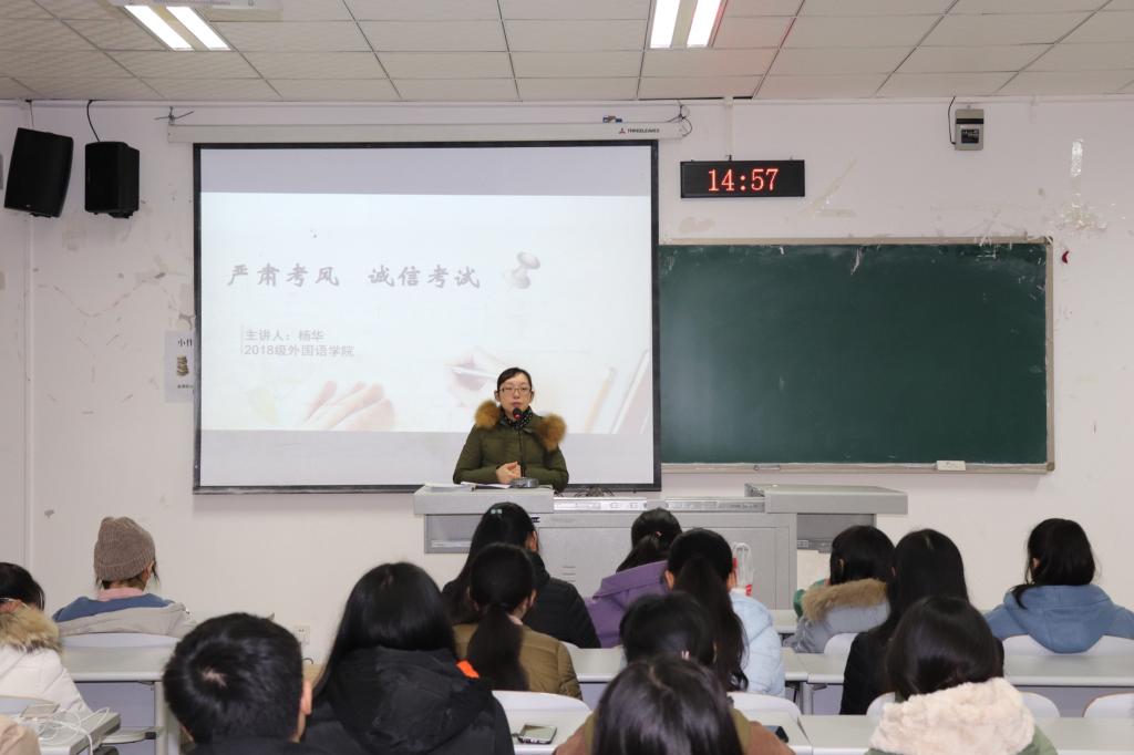 为了营造良好的考试氛围,净化考场环境,12月25日下午14:30,必赢242网址于明辨楼一栋202室开展了 “严肃考风,诚信考试”的主题大会,此次大会由18级辅导员杨华老师主持,必赢242网址2018级全体同学参加。