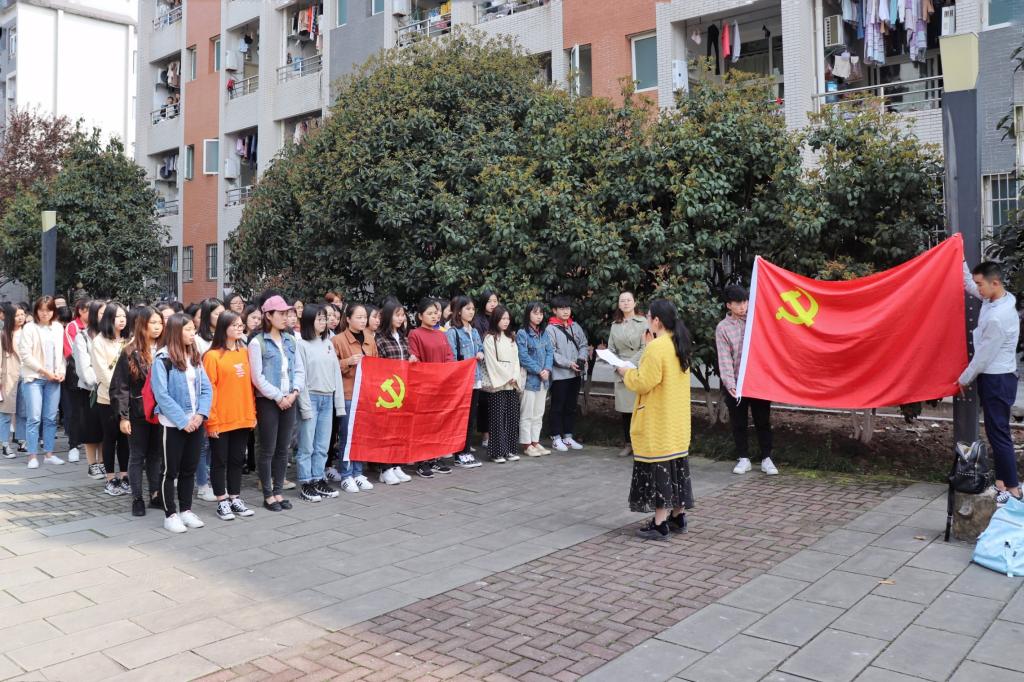 活动中,任老师向大家介绍了此次活动的目标及流程,并带领大家进行入党宣誓活动。毕业生党员张宁向大家宣读了《必赢242网址学生党员示范制实施办法(修订稿)》,并作为学生党员代表发言,表示作为学生党员要发挥好模范带头作用,要在思想、学习、工作、日常生活等各个方面中做好榜样。