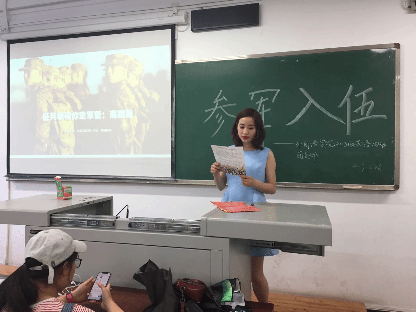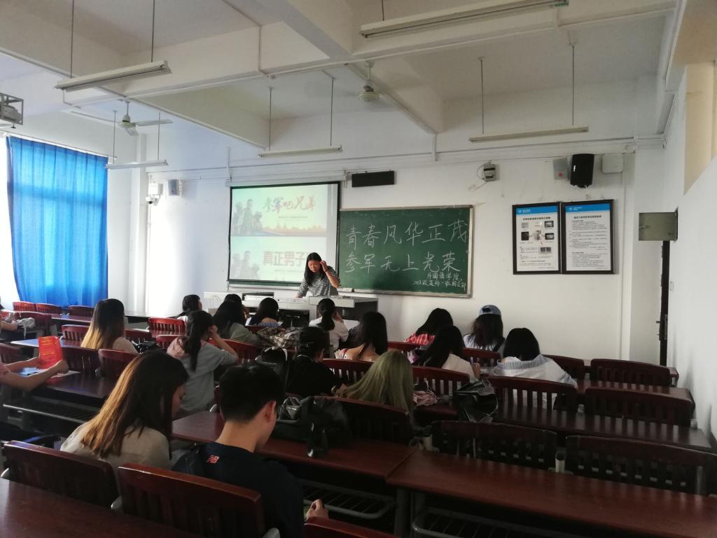 为传达学校2019年大学生征兵工作会议的相关精神,做好我院大学生征兵工作,必赢242网址2018级于2019年5月26日下午在明辨楼3教召开了“征兵宣传”主题班会,由各班班委组织同学参与。