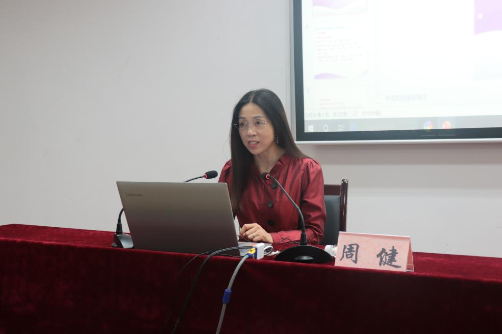 周健老师以一句绕口令开启关于语音语调的讲课。周老师指出,英语之难不在其他,而在于读的少,肌肉不够灵活,口语练习必须苦在日常。她从元音、辅音、连读、浊化音等方面提醒同学们的发音误区。