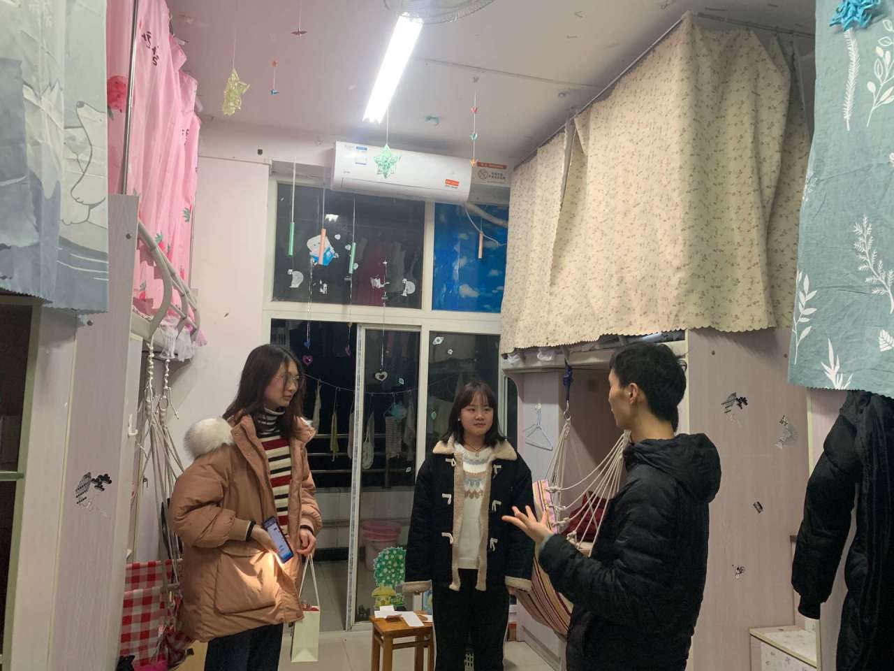 12月24日晚,我院各年级辅导员深入学生寝室,关心同学们的学习、生活情况。走访过程中,各年级辅导员与同学们亲切交谈,认真聆听了同学们的心声,为同学们答疑解惑;强调了期末考试纪律,坚持诚信考试,积极备考,提高复习效率,学会劳逸结合;仔细排查了寝室安全隐患,注意用电安全;强调了“两节三夜”期间的安全问题,严格请销假制度。