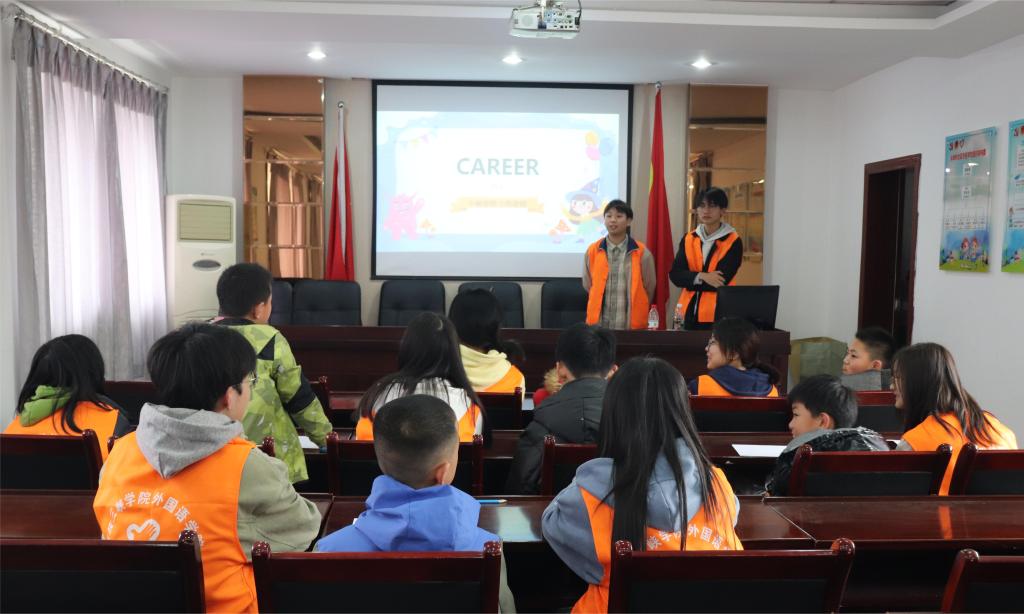 英语课堂上,志愿者通过生动形象的图片,带领同学们进入多姿多彩的职业世界,在了解不同职业特点的同时,小朋友们也学会了与职业相关的英语单词及英语表达。最后,小朋友们还用图画描绘了心中的职业理想。