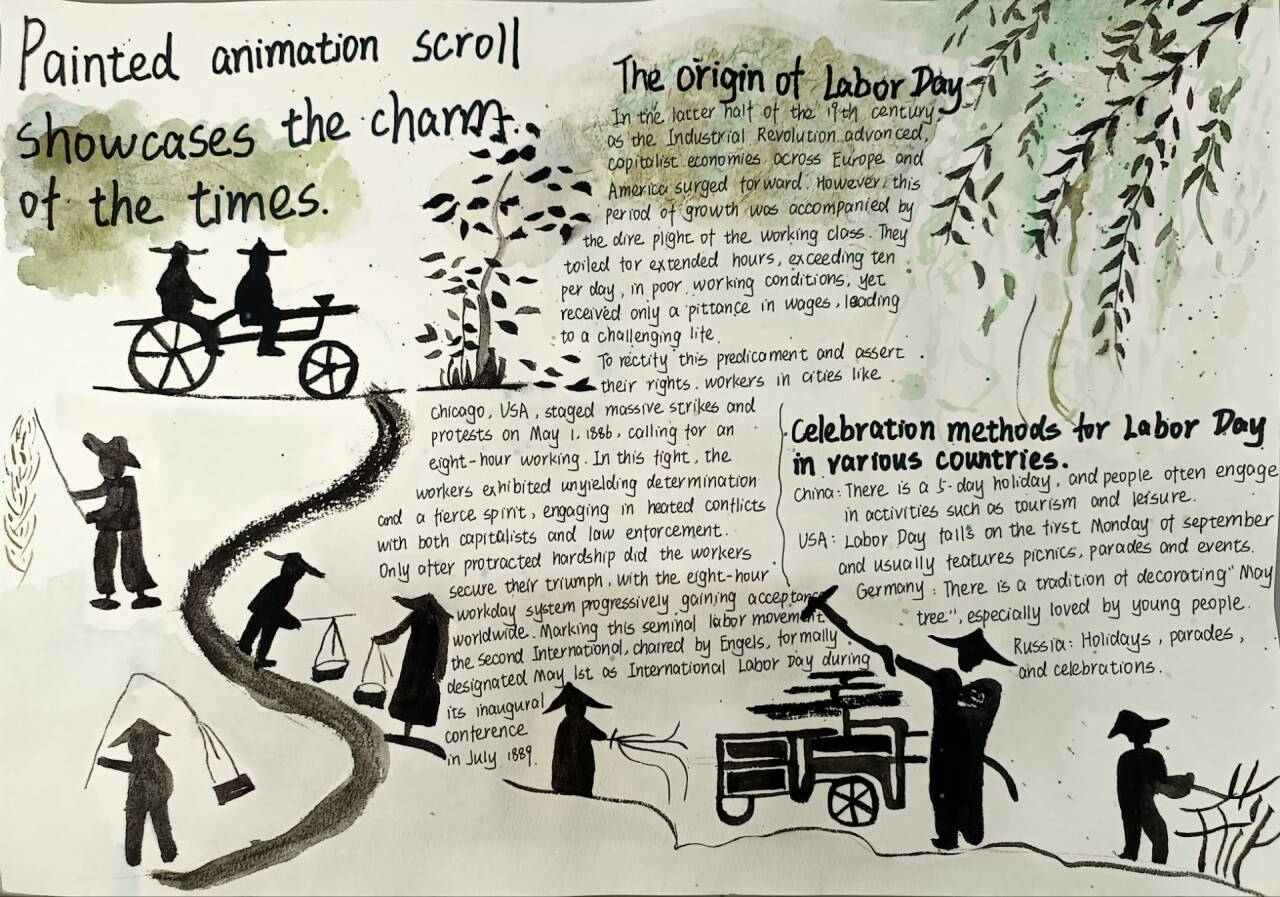 本次比赛面向全校同学,共收到324份作品,经过评选,10个优秀作品脱颖而出。同学们以劳动为主题,用画笔描绘出了一幅幅生动形象的劳动场景:作品《致敬劳动者》,展现了劳动者在不同岗位上辛勤耕耘的身影;作品《May Day》描绘了劳动者欢度节日的欢乐场面;作品《Labor Day》用鲜艳的色彩描绘出一幅充满生命力的劳动景象……同学们用手抄报向劳动者致敬,弘扬劳动精神。