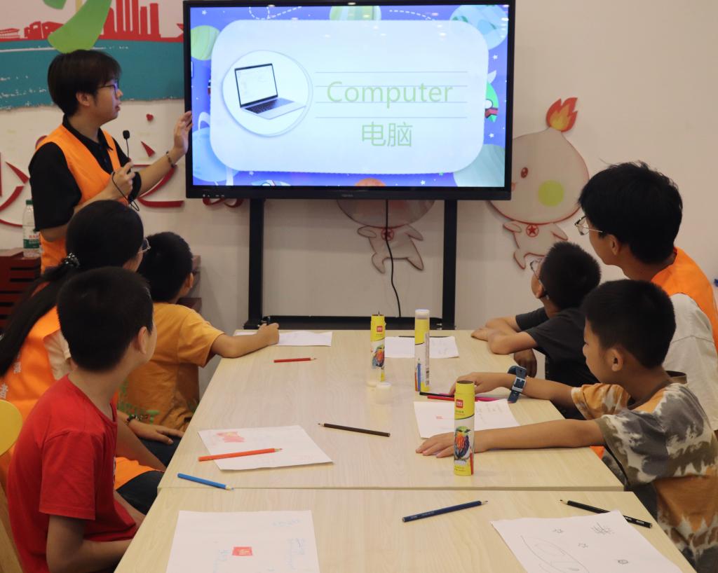在课堂上,志愿者向社区孩子教授“Robot、Internet、Website”等科技方面的英语单词、组织学生观看科技类视频,并带领孩子动手完成科技小实验。