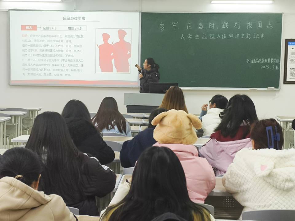 班会上,辅导员首先强调了应征入伍对于同学们个人成长与国家发展的重要意义,就大学生应征入伍政策、入伍条件、报名流程、优待福利等信息进行详细说明,让同学们清晰地看到了军旅之路的广阔前景。随后,退伍复学的外院学子分享了自己的参军入伍经历,那些艰苦却充满力量的日子,令同学们心生向往之情。最后,辅导员们鼓励同学们投身国防事业,以实际行动践行“天下兴亡,匹夫有责”的崇高使命。
