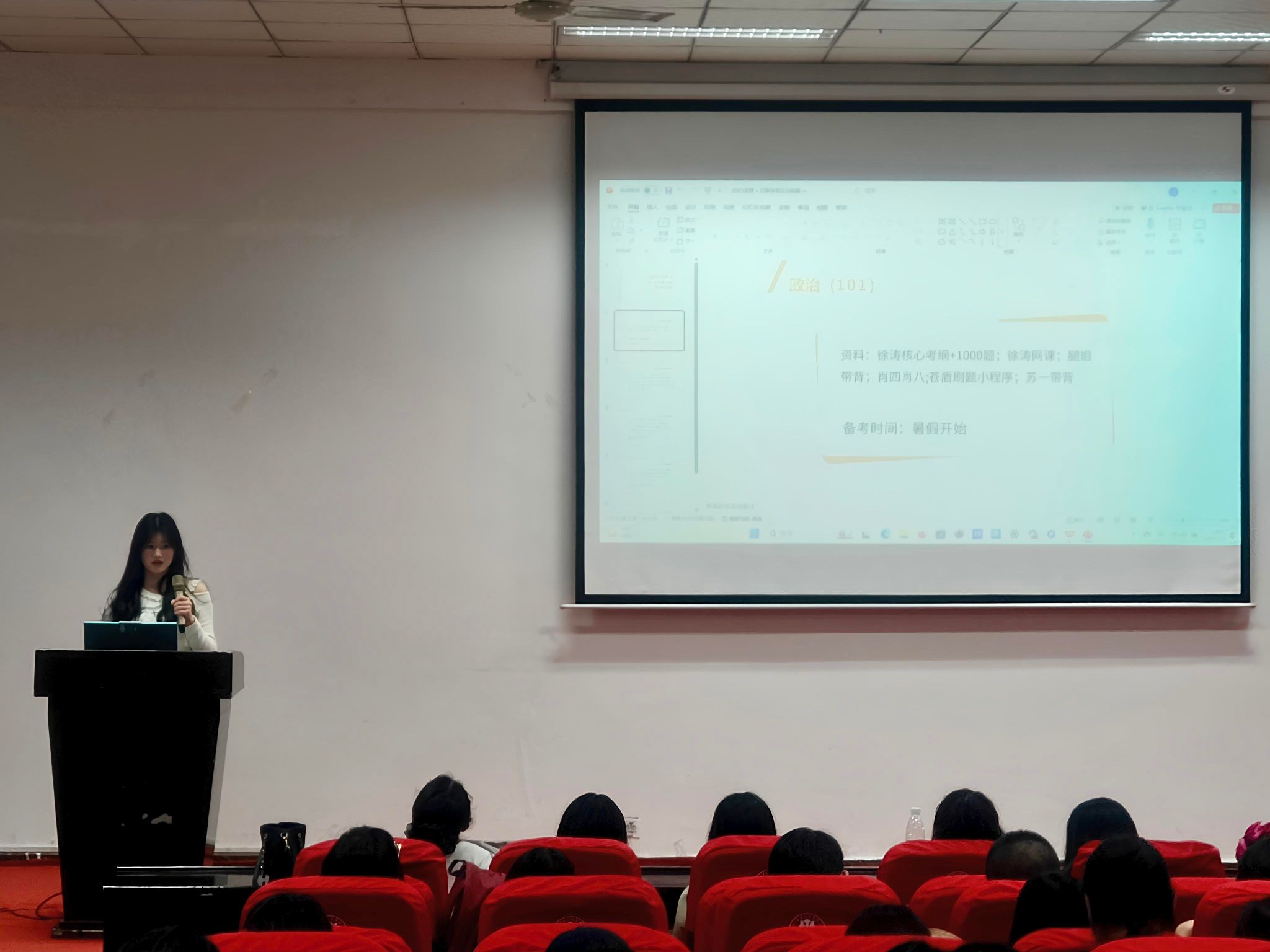 分享会上,各位学长学姐结合自身经验与实际情况,从考研、考编、考公的报考和备考等方面进行详细介绍。考研成功上岸的学姐从“院校选择”“复习节奏”“心态调整”三方面展开分享。她强调:“考研是一场信息战,需提前了解目标院校的报录比和命题风格。”