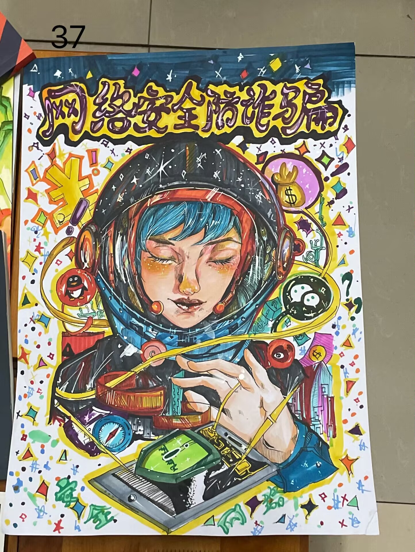 此次大赛作品丰富多样,涵盖绘画与书法。绘画作品视角多元、主旨鲜明,有的作品以警察形象搭配网络元素,警示信息泄密、贷款诈骗等风险,呼吁筑牢网络安全墙;书法作品也别具韵味,以刚劲有力的字体,将国家安全与传统文化紧密勾连,深刻体现网络安全重要性与守护决心。本次活动从主题契合度、艺术表现力、创意新颖性等维度进行综合评审,最终评选出10份优秀作品。其中,2023级学科英语2班左园园同学凭借其突出的创新性和强烈的表现力,荣获一等奖。
