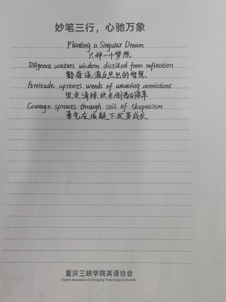 本次活动以“青春/校园/梦想”为主题,以三行诗的形式进行英文写作,吸引了全校各学院330余名同学积极参与。参赛选手将原创摄影、手绘等图画设计与英文三行诗巧妙结合,生动展现了三峡学子对青春、梦想、拼搏的深刻理解,对美好事物的积极追求。