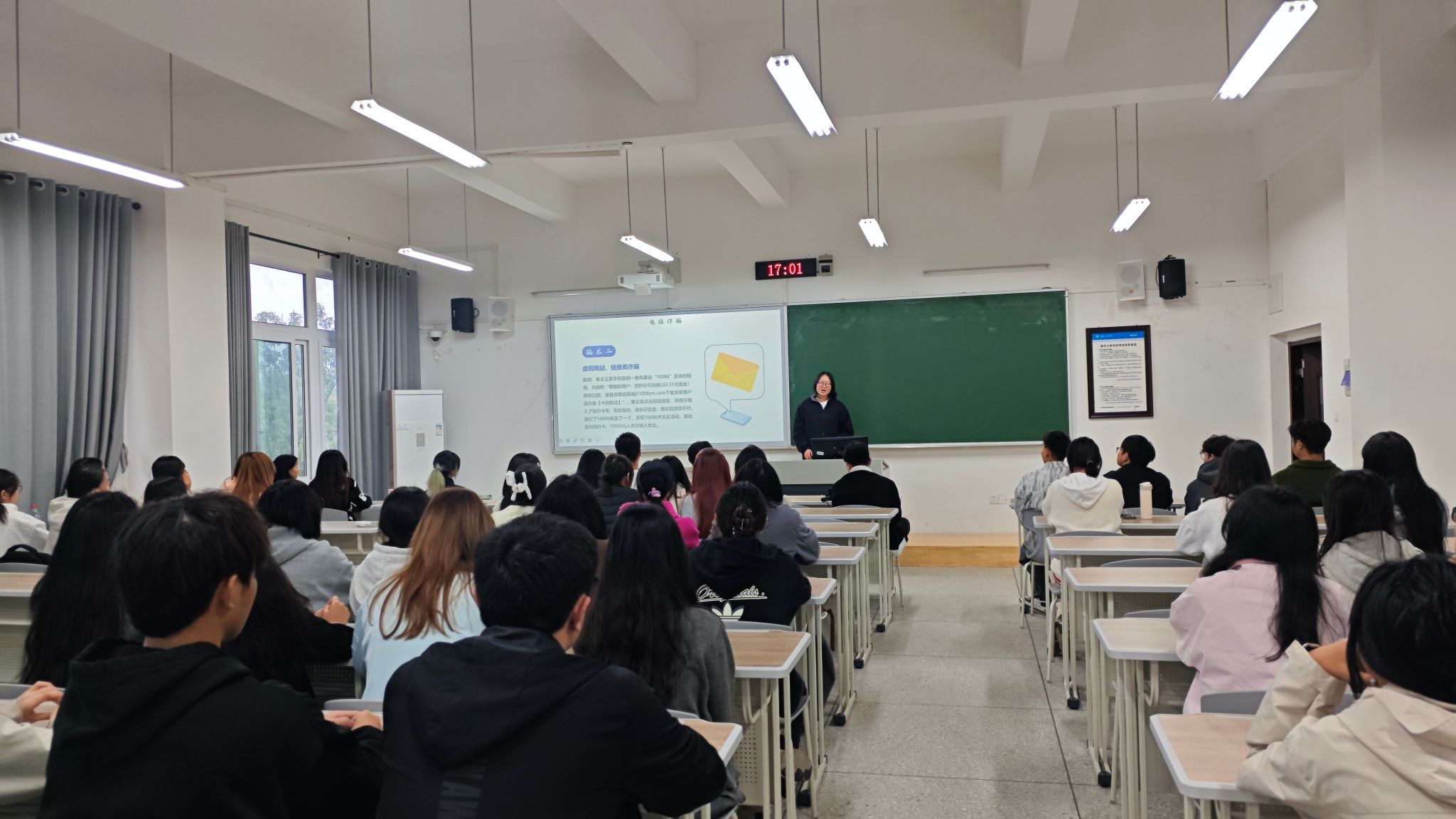 辅导员老师通过分析“AI换脸诈骗”、“刷单返利”、“冒充客服”等网络作案手段,揭示网络犯罪的常见手法与严重危害,教育引导学生自觉抵制不良信息,不轻信、不透露、不转账,提升辨别能力和防护技能。此外,结合当前高发的网络诈骗、个人信息泄露、网络借贷陷阱、网络谣言传播等典型案例,老师们向大家普及了《网络安全法》、《个人信息保护法》等相关法律法规。