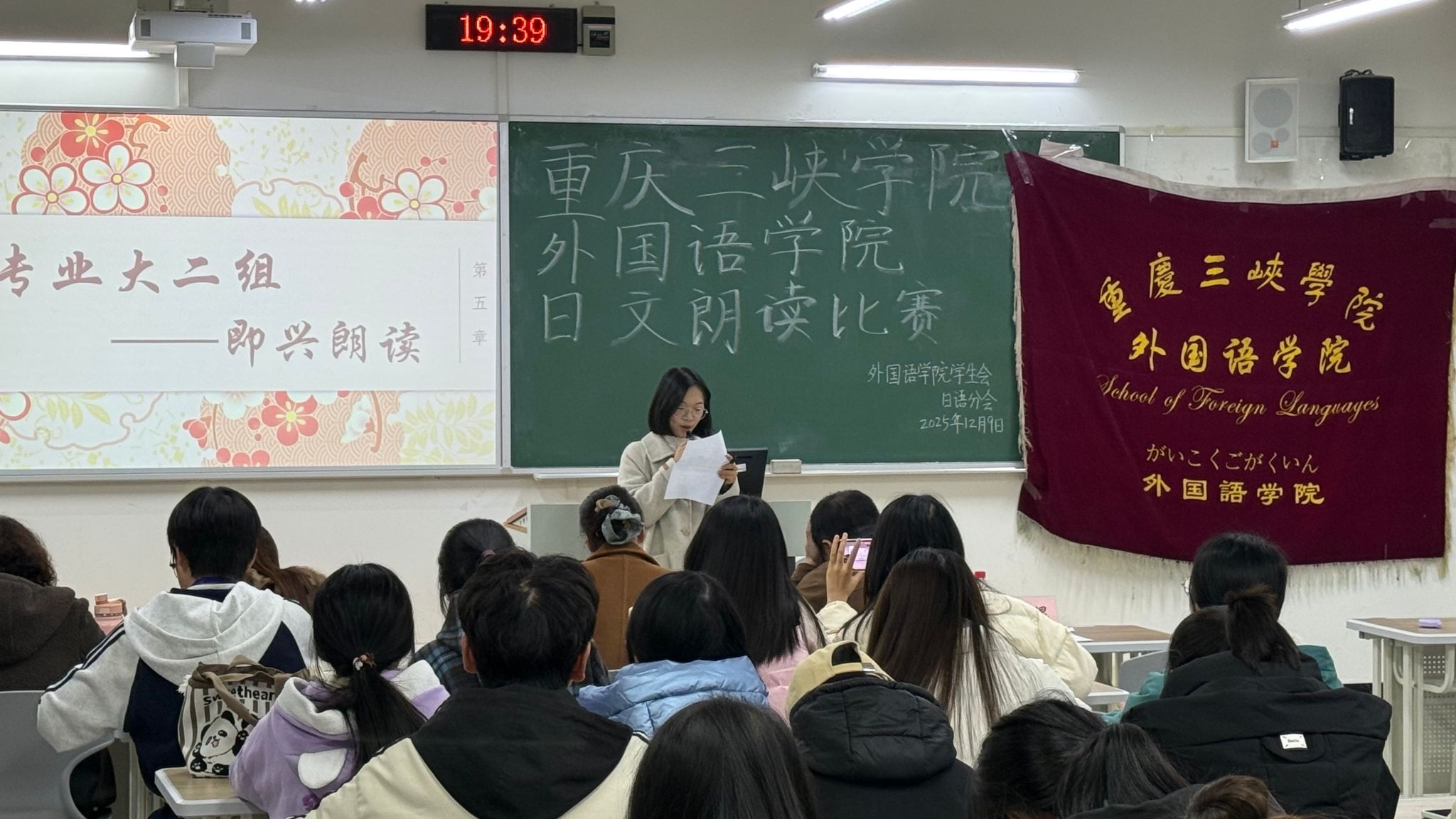 2025年12月9日晚,必赢242网址于博学楼1栋105举办“咏东瀛物语,诵和韵诗篇”日文朗读比赛。陶伯玲、杨红、杨睿智、魏添夏四位老师担任评委。