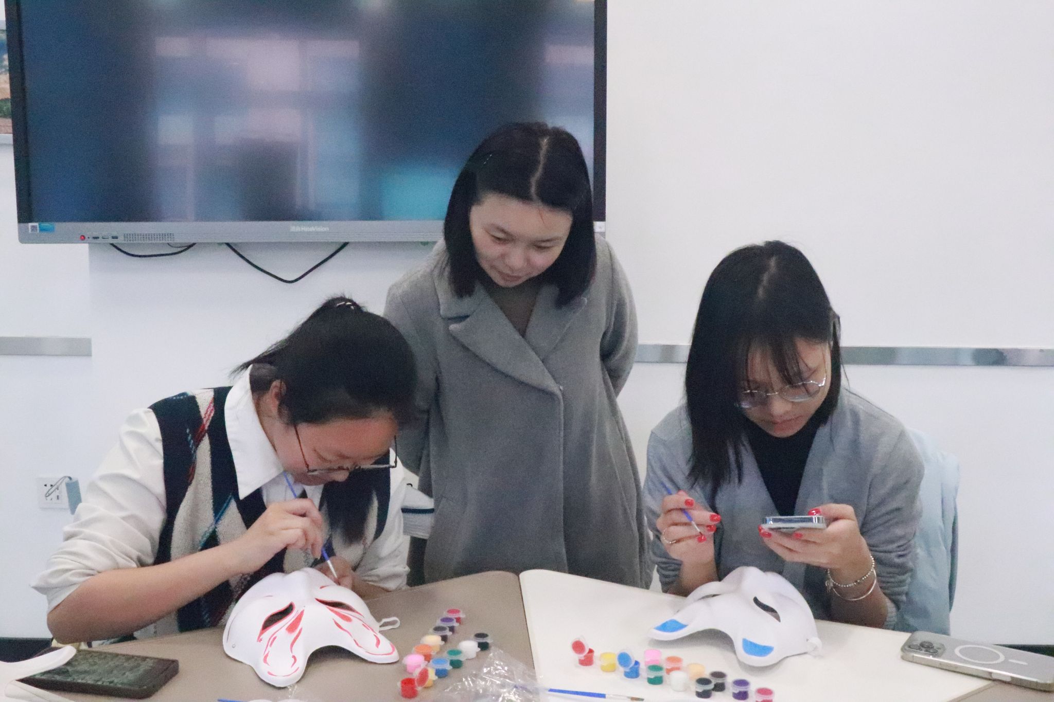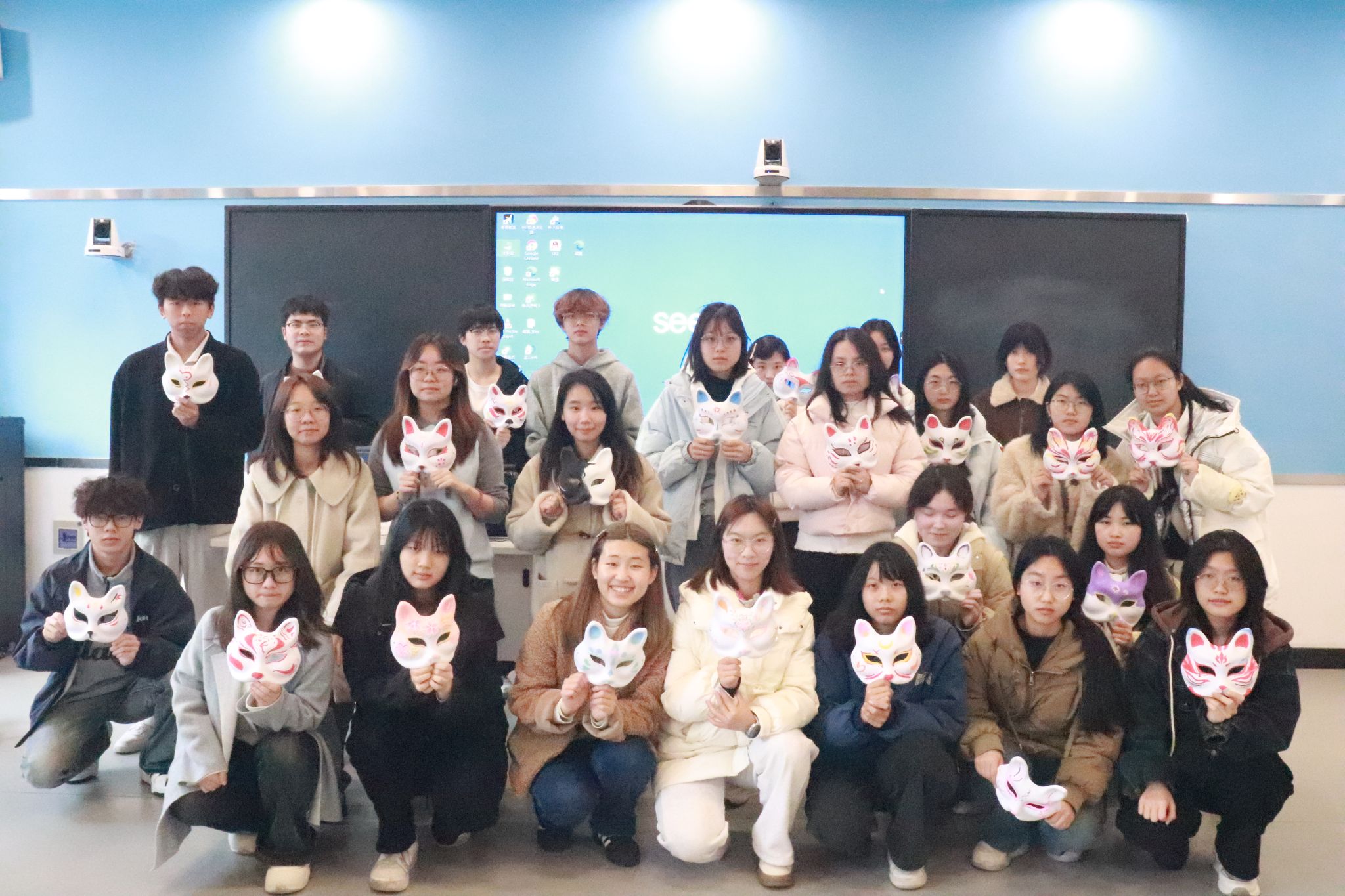 此次日语角以“狐面の絵付け体験”为交流学习主题,现场同学在杨琨老师的带领下亲手完成狐面绘制,并用日语介绍自己所制作狐面的设计思路、色彩搭配等,现场气氛热烈欢快。对于同学们的日语描述与准确表达,杨琨老师也及时引导。