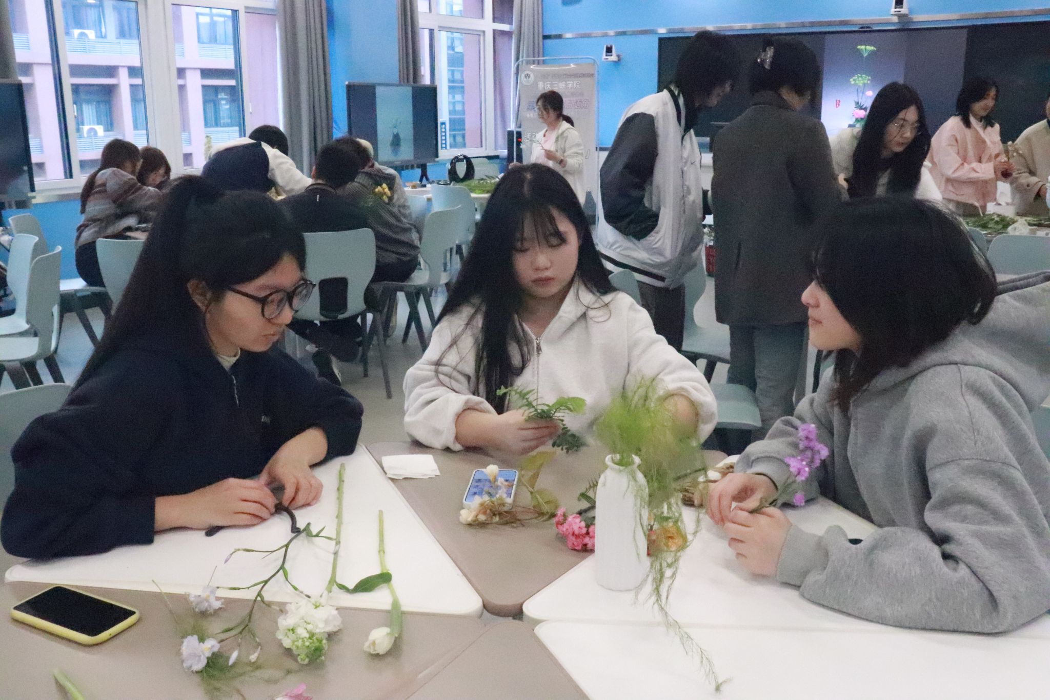 活动中,杨红老师结合日语专业知识,生动讲解了“生け花”的历史渊源、文化内涵及基础技法。在实践环节,同学们动手插花,学习相关日语词汇,并在交流中分享感悟。轻松愉快的氛围有效提升了大家的日语应用能力。