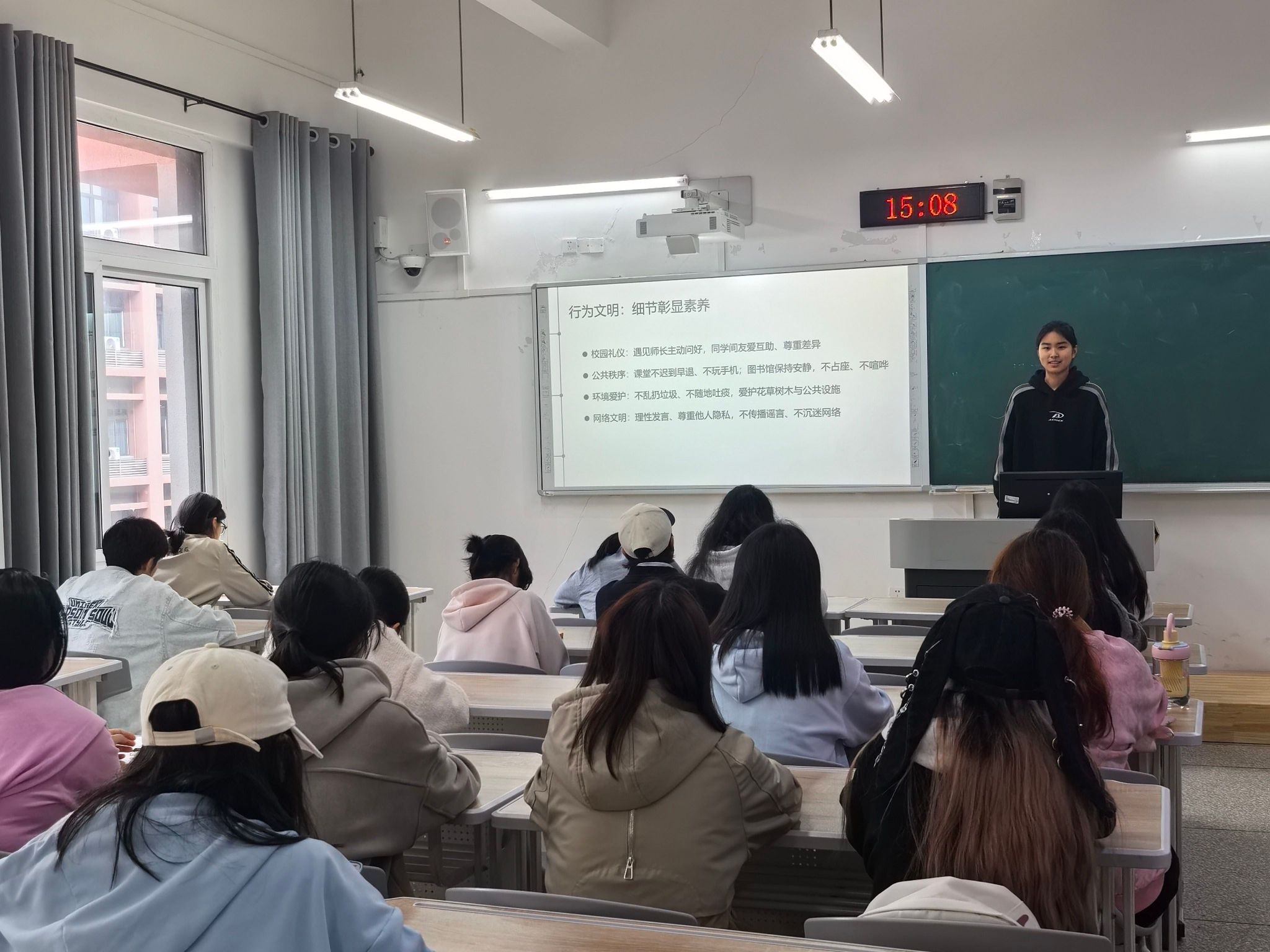 各班级在班委的组织下,围绕“读书与文明的时代意义”“读书节倡议与阅读指南”“校园文明核心规范”“文明养成实践路径”四个板块开展主题班会。有的班级通过分享经典书籍、交流阅读心得等形式,充分激发学生阅读热情。有的班级发起了“每日阅读1小时”“每月精读1本书”的倡议,号召大家从课堂礼仪、学术诚信、宿舍生活等细节入手,争做文明践行者。