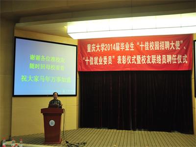 2014年6月20日,由重庆大学校友总会主办的重庆大学2014届毕业生“十佳校园招聘大使”、“十佳就业委员”表彰仪式暨校友联络员聘任仪式在A区国际会议厅成功召开。重庆大学党委副书记肖铁岩、党委学工部部长严太华、重庆大学校友总会秘书长许骏等出席了会议,来自各个学院的200多名2014届校友联络员参与了会议。此次大会肯定了过去一年我校的毕业生就业工作并对其中表现突出的学生干部进行表彰。