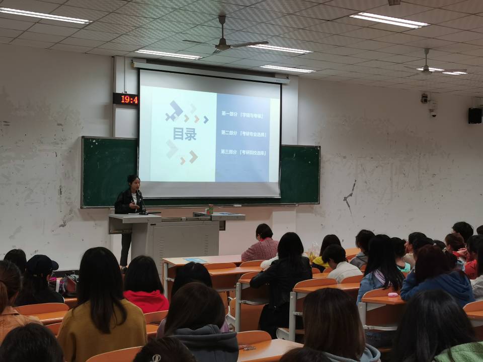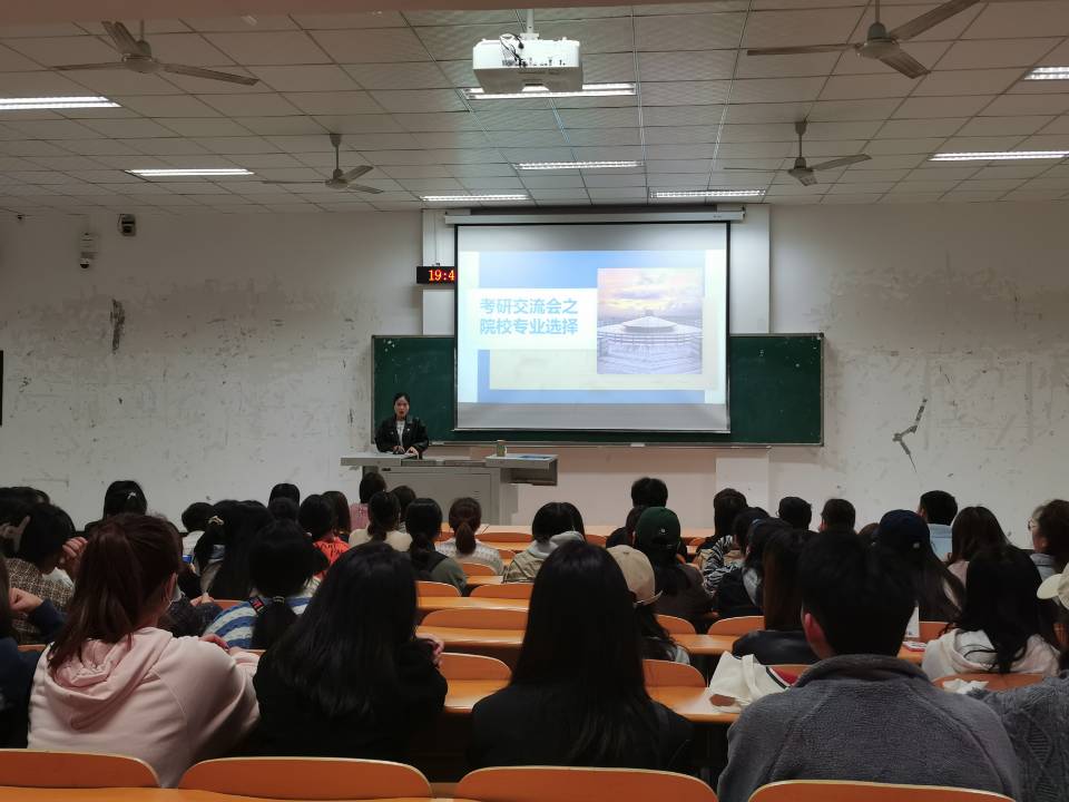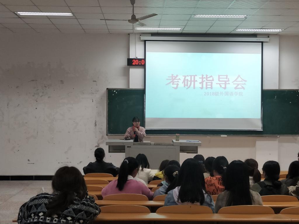 会上,夏腾老师给同学们认真分析了学硕与专硕之间的区别,对于同学们的考研意向选择进行了专业的指导,并对同学们的复习备考提供了经验。日语系主任杨红老师就日语专业同学的考研意向选择进行了面对面交流,并对英语专业同学考研中的第二外语备考科目的准备提供了科学指导。