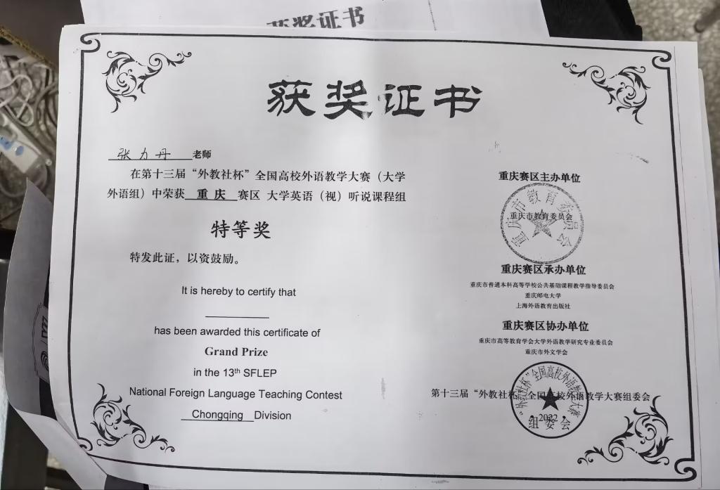 我院张力丹老师在第十三届“外教社杯”全国高校外语教学大赛(大学外语组)中荣获重庆赛区大学英语(视)听说课程组特等奖,全国总决赛视听说课组三等奖。我院向此表示热烈的祝贺!