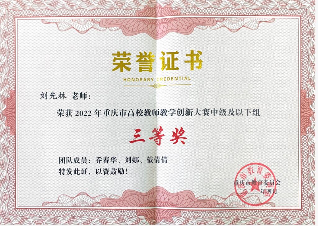 我院刘先林、乔春华、刘娜、戴倩倩老师荣获2022年重庆市高校教师教学创新大赛中级及以下组三等奖。我院向此表示热烈的祝贺!