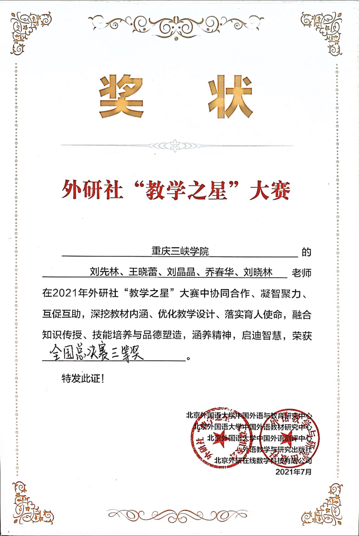 我院刘先林、王晓蕾、刘晶晶、乔春华、刘晓林老师在2021年外研社“教学之星”大赛中协同合作、凝智聚力、互促互助,深挖教材内涵、优化教学设计、落实育人使命,融合知识传授、技能培养与品德塑造,涵养精神,启迪智慧,荣获全国总决赛三等奖。我院向此表示热烈的祝贺!