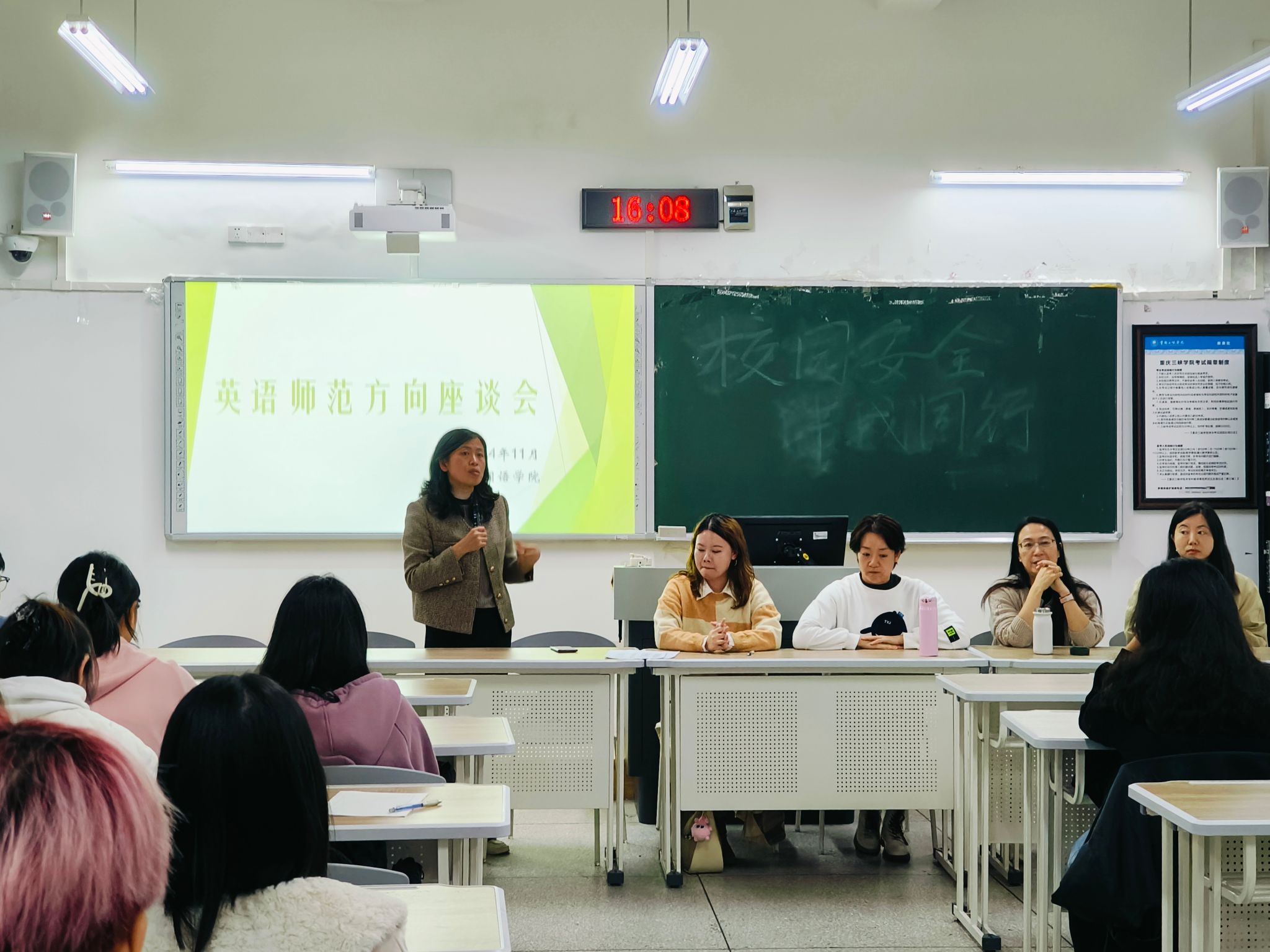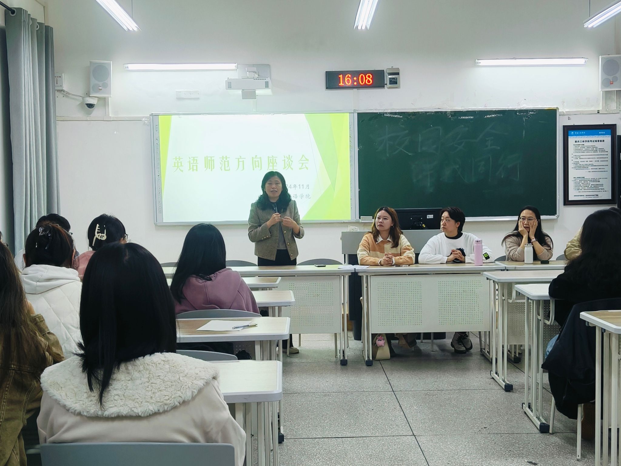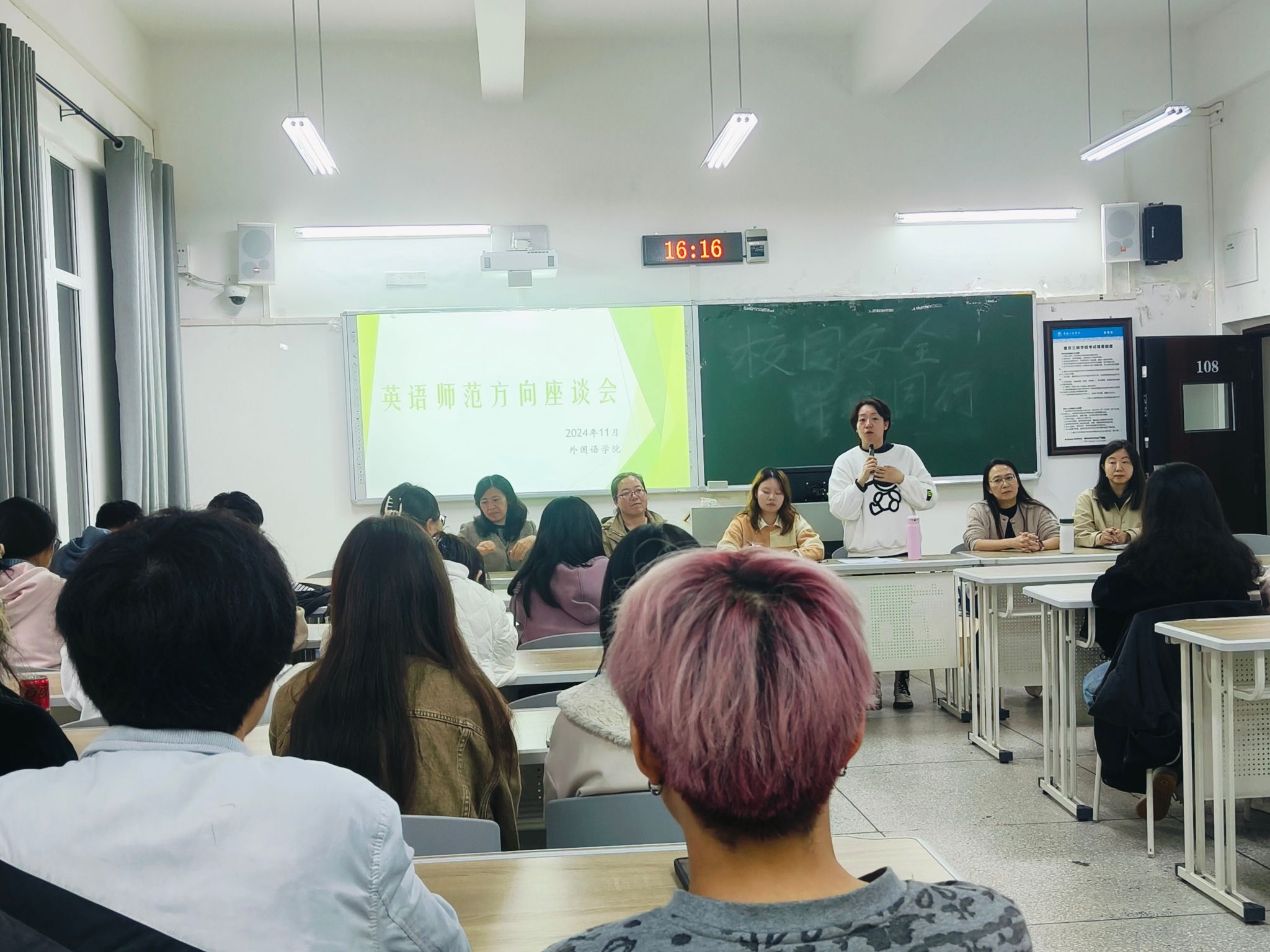 必赢242网址于2024年11月14日下午四点在博1-108举行了英语师范方向学生座谈会。24级、23级、22级师范方向学生代表参加了座谈会。出席座谈会的任课老师有乔春华、肖祎、戴倩倩、刘先林、等。座谈会由英语系主任乔春华主持。