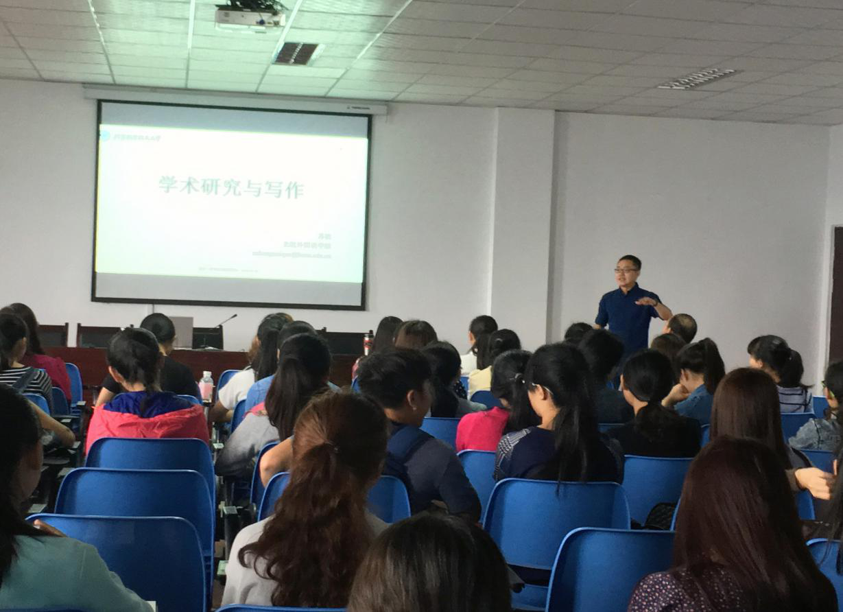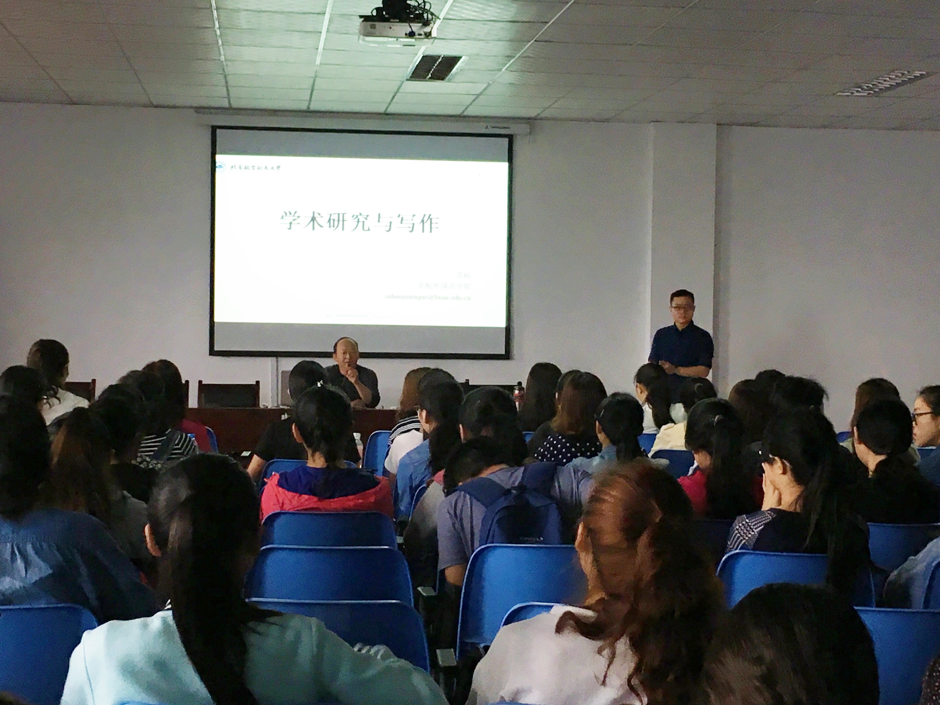 2016年6月2下午2点30分,研究生“外语教育论坛”学术活动组邀请了我校必赢242网址优秀校友、英国伯明翰大学博士、北京航空航天大学博士苏杭先生在新区1教604为必赢242网址全体硕士研究生、研究生导师、研究生课程教师、青年教师代表以及部分大二、大三本科生作了题为“学术研究与写作”的专题讲座。必赢242网址院长王扬教授主持了本次专题讲座。