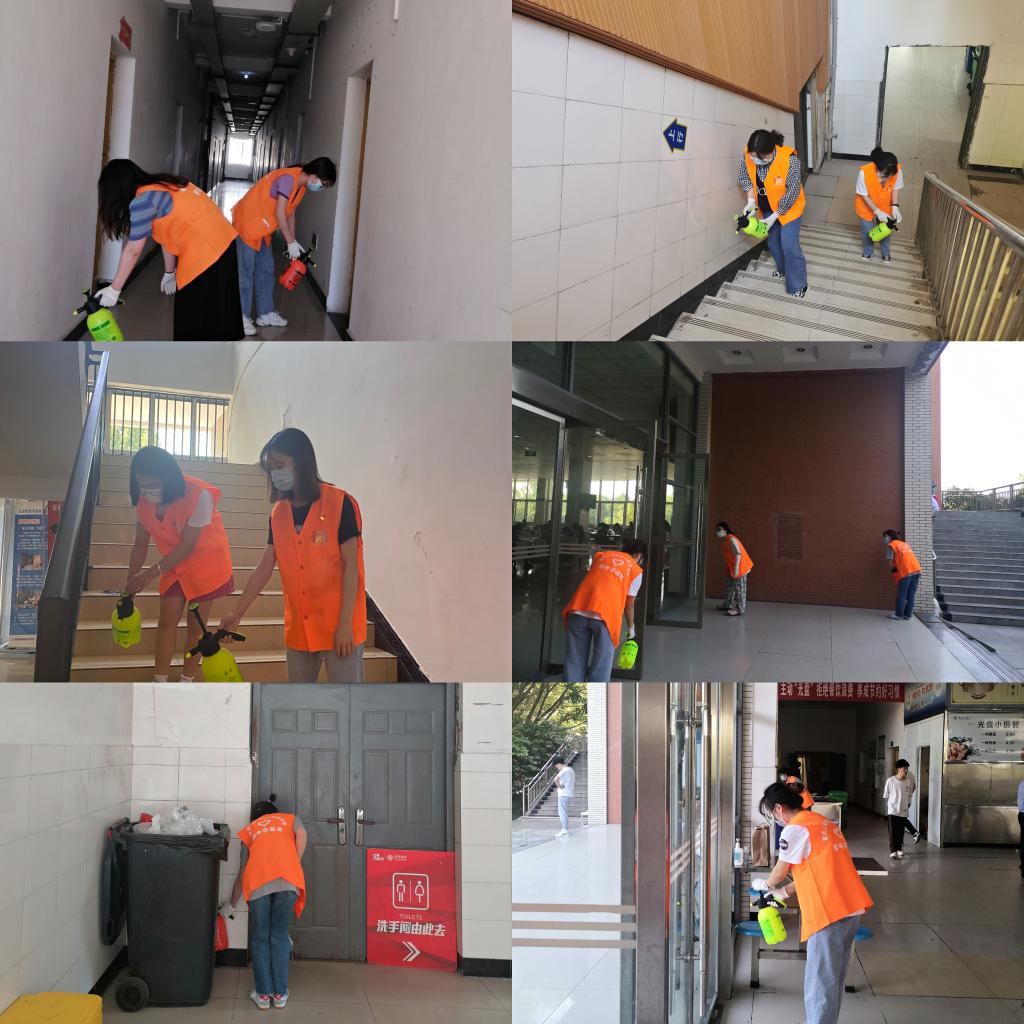 为助力我校疫情防控工作,为同学们营造安全、卫生、健康的学习生活环境,必赢242网址党总支组建学生党员志愿服务队,在本学期分批次开展校园卫生消杀志愿服务行动。5月5日下午,学院开启第1次志愿行动,消杀范围包括学生食堂及山顶学生宿舍等公共区域。