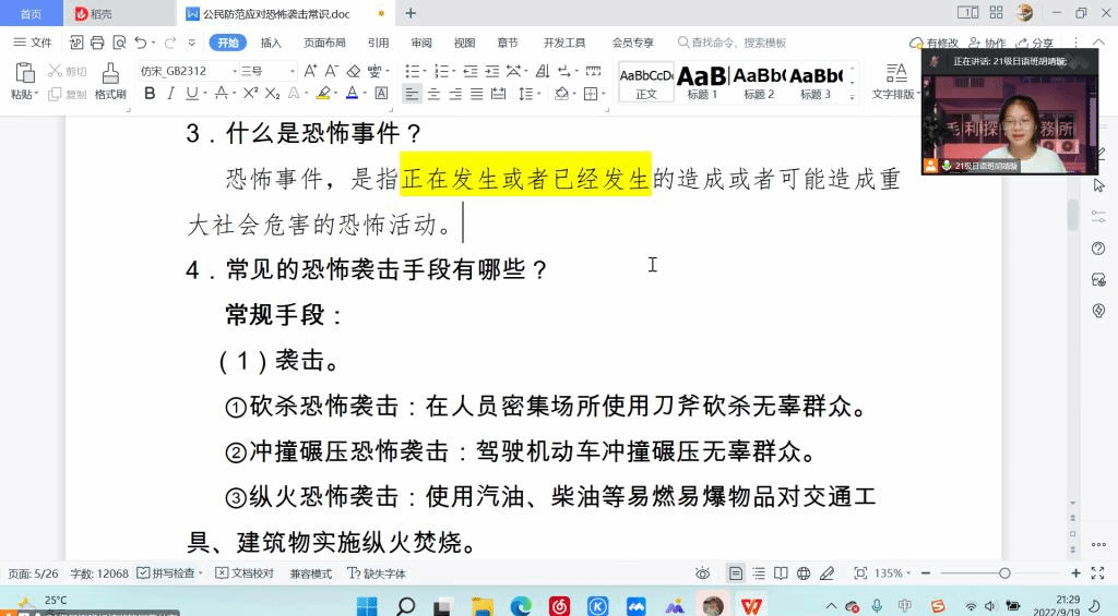 各年级各班通过线上主题班会和寝室集体学习等方式,观看防范恐怖袭击宣传视频,学习《国家安全法》和《反恐怖主义法》以及反恐怖主义案例、应对恐怖袭击常识等,让同学们深入了解什么是恐怖主义、恐怖活动有哪些、防恐措施有什么,教育同学们主动杜绝接触恐怖和暴力主义,有针对性地传授同学们发现可疑人员、遇到刀斧砍杀、驾驶机动车冲撞碾轧、密集场所发生爆炸、故意纵火等恐怖袭击的防范应对方法,以及在遇到恐怖袭击紧急情况下如何开展自救和救护等知识和技能。