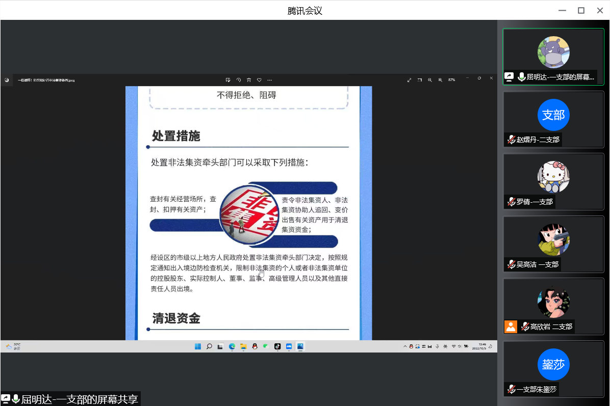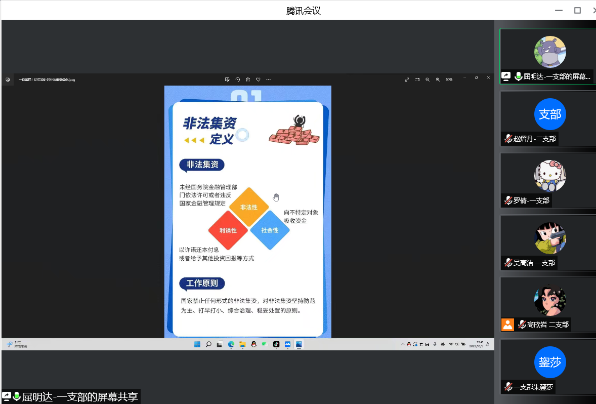 为帮助广大党员同志树立正确投资理念,防范非法集资陷阱,坚决杜绝组织、参与非法集资犯罪或为非法集资犯罪行为提供便利等情况发生,10月5日晚上,必赢242网址学生党支部通过腾讯线上会议方式,开展了“防范和处置非法集资宣传教育”活动,支部全体党员参加了学习。