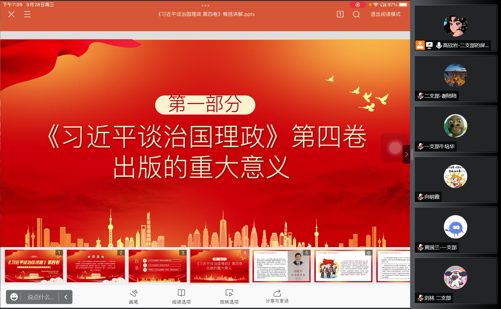 为迎接党的二十大胜利召开,引导我院学生党员忠于祖国、忠于人民,培养担当民族复兴大任的时代新人,9月28日晚,我院学生党支部通过腾讯会议组织开展《习近平谈治国理政》第四卷学习。支部全体党员参加学习。