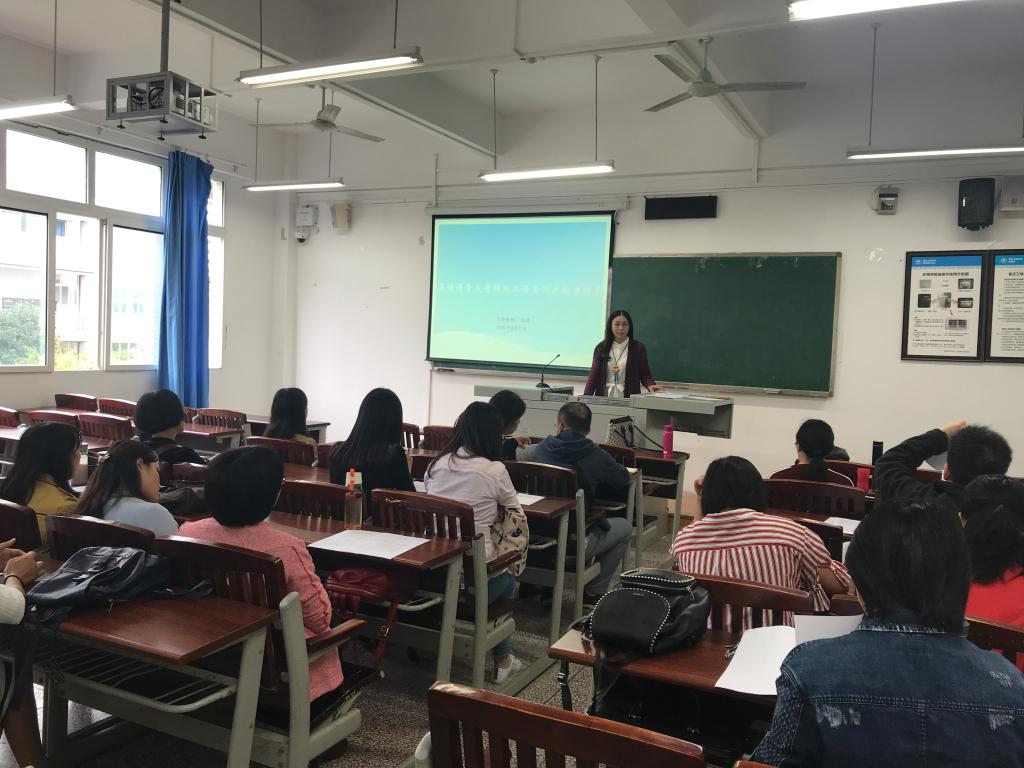 2018年9月27日下午,英语系全体教师在1J310参加了本学期第一次系部主题教研活动——《英语语音发音辨析及语音测试标准探索》。本次教研活动由周健老师主讲,周老师从发音部位、发音中如何送气、中英文发音区别入手,并通过模仿动物发音、各地区方言等不同方式讲解了英语语音发音技巧。参会教师也积极主动模仿,并不时提出疑惑和分享自己的发音体会。周老师还为老师们详细讲解了本次语音测试的要求,特别是学生易错的发音、连读、失去爆破等测试细节及注意事项。此次主题教研活动使教师们受益匪浅,既提升了教师们的发音技能,也为之后举行的语音测试统一了评分标准。