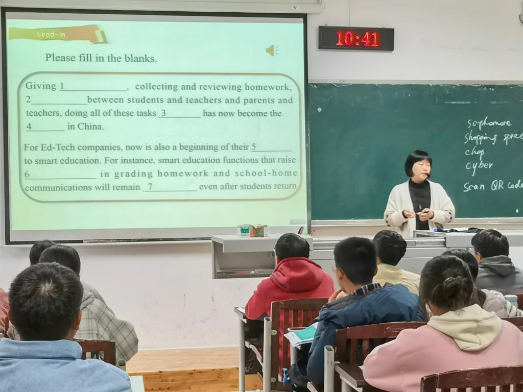 11月16日第3-4节,我院教师程旭在明辨楼1-212为全体听课教师展示了新视野大学英语一第三单元Digital Campus的导入部分的教学范例。首先,教学选取了贴近生活的图片引导学生快速回答“互联网给我们生活带来的变化”,而后聚焦随疫情爆发而兴起的“线上教学”。同学们基于新闻视频开展了两人对话(分享自己上网课的经历)和小组讨论(线上教学的利弊),并将小组讨论结果发布至学习通讨论区。最后,程旭老师对讨论环节作了总结和点评,并结合思政元素告诫同学们,“新时代大学生应充分利用好互联网带给我们的丰富资源和学习机会,善于思考积极进取;坚持正确的价值取向,远离网络游戏,成为新技术的主宰者!”