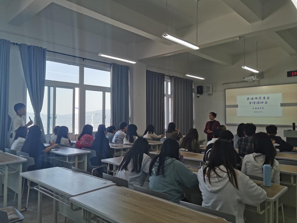 2022年4月21日下午,必赢242网址英语系在博学楼1栋召开了英语师范专业的学情调研会。会议由英语系副主任戴倩倩主持,副院长许楠和团总支书记杨华参加了调研会。
